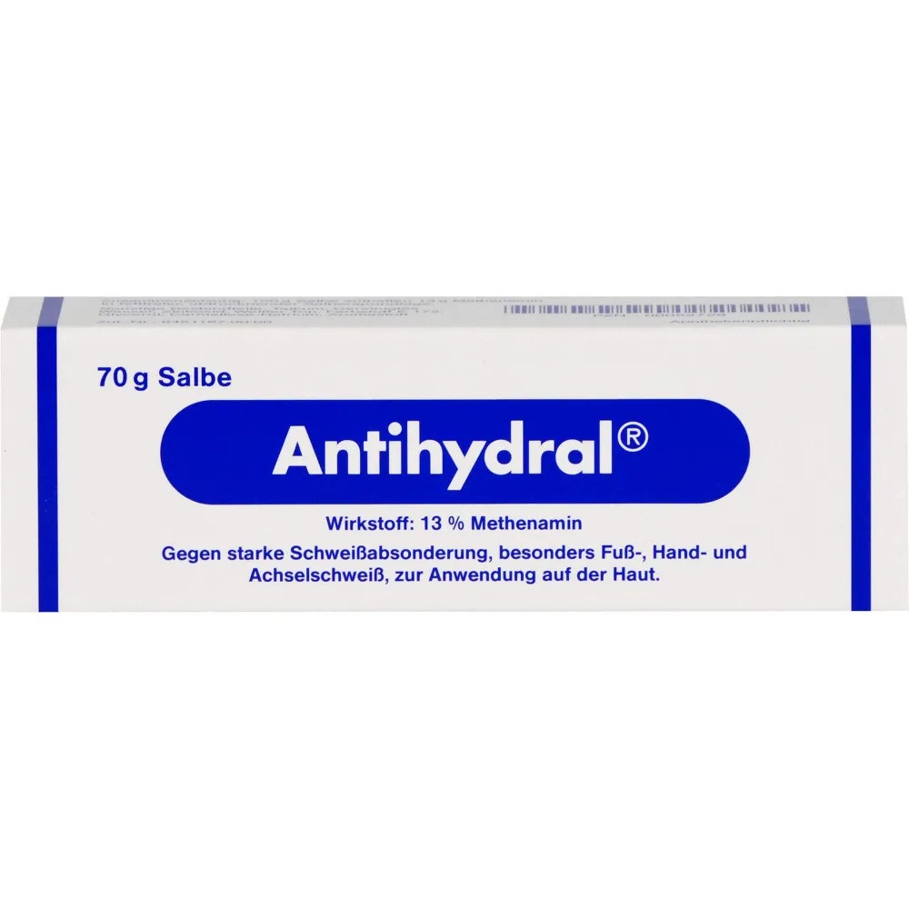 Antihydral is an ointment paste containing the active ingredient methenamine in a non-greasy, drying ointment base. It has been successfully used for decades as an antiperspirant for weeping foot skin—particularly between the toes—but also for hand and underarm sweat. Antihydral dries up as excessive sweat is secreted. It does not suppress sweat secretion but normalizes it. It contains no soluble aluminum salts.